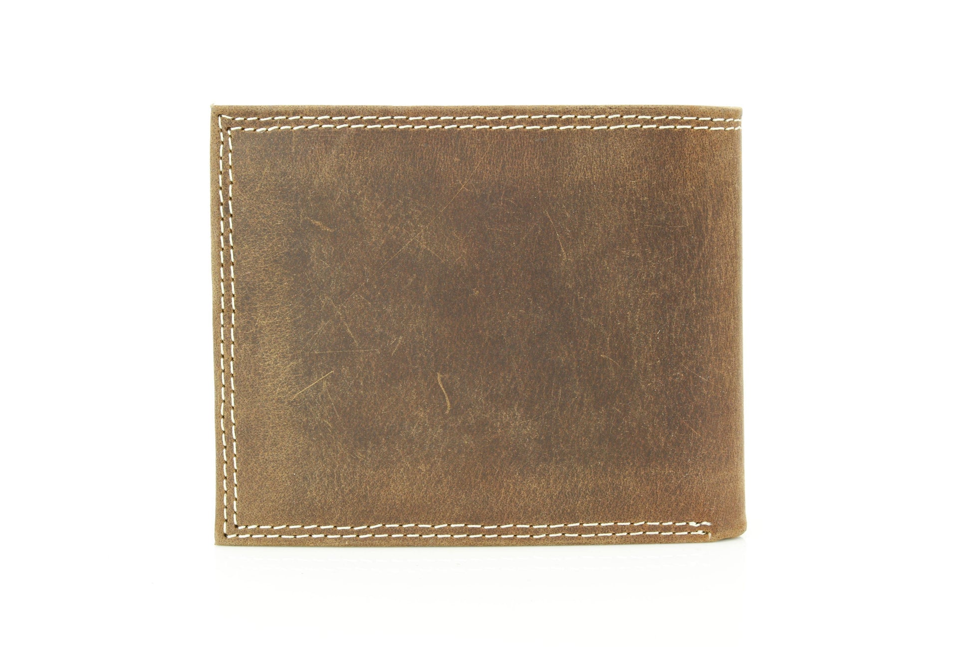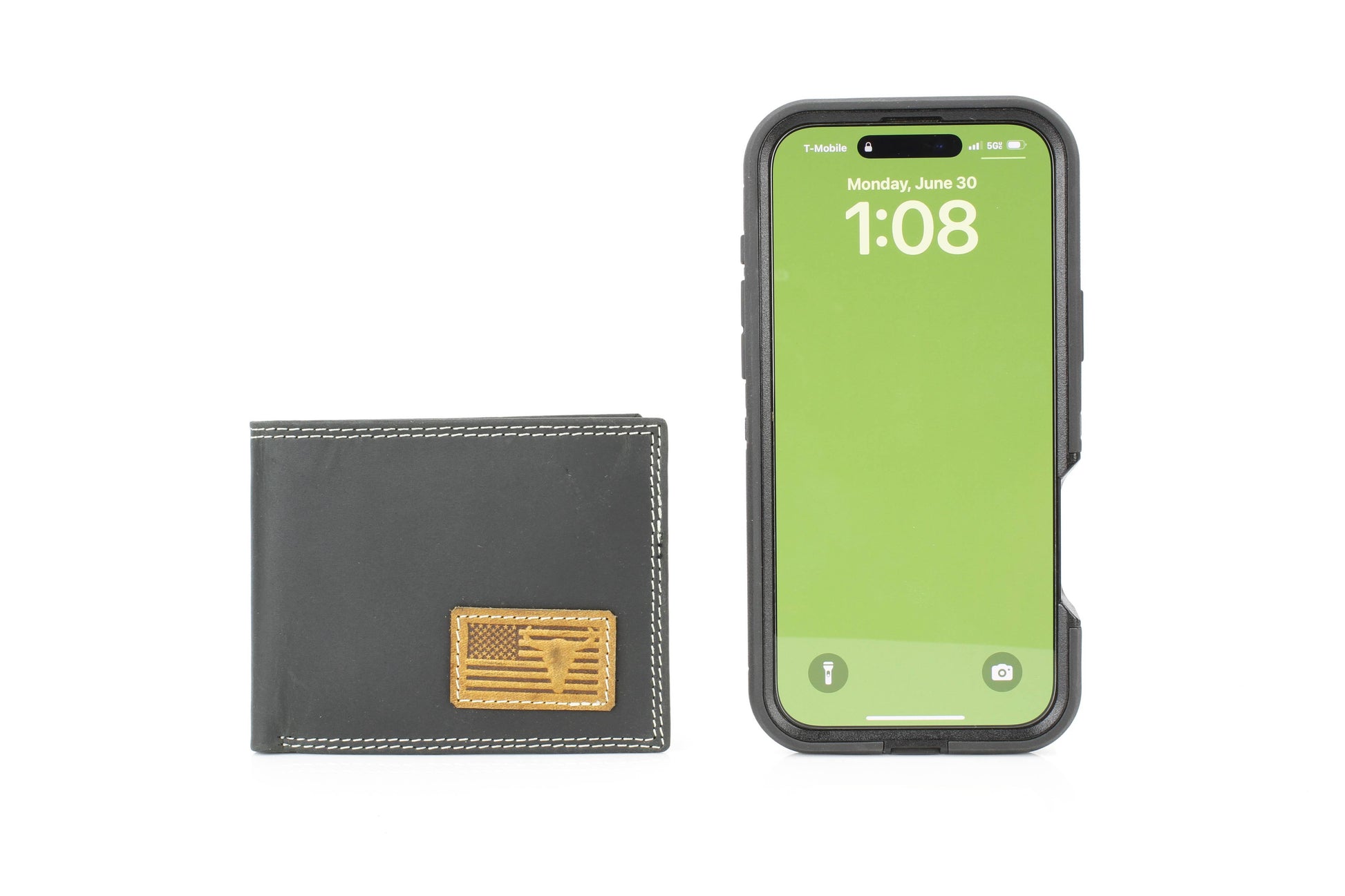 Crafted from American Bison leather, this men’s bi-fold wallet blends durability with a bold patriotic design. The exterior showcases an embossed American flag patch in the bottom corner, accented with precise double-row white topstitching for a clean, rugged look. Designed to be both functional and stylish, this wallet includes a practical interior layout with a fold-over flap that provides access to two clear ID windows—ideal for your driver’s license, work ID, or other essentials. It also offers six card slots and two separate bill compartments, making organization effortless while keeping a slim profile. Packaged in a wooden box, it also makes a great gift. Available in black, brown, and tan.