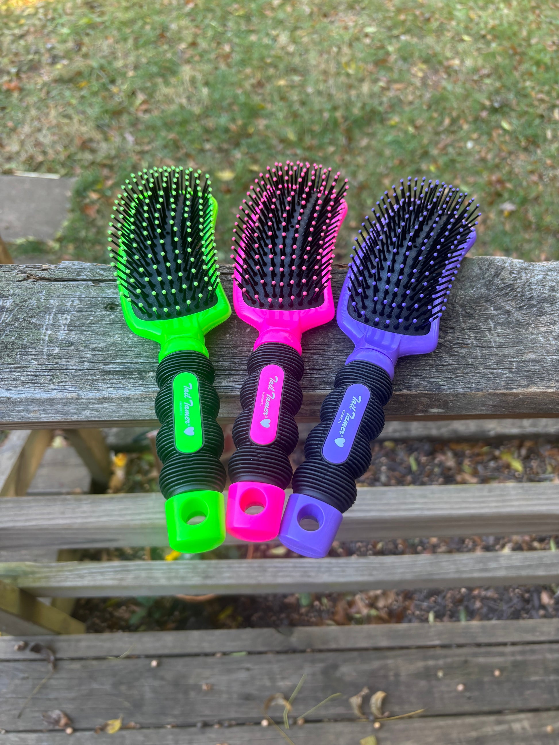 Curved handle mane and tail brush in 3 bright colors: hot pink, purple, lime green.