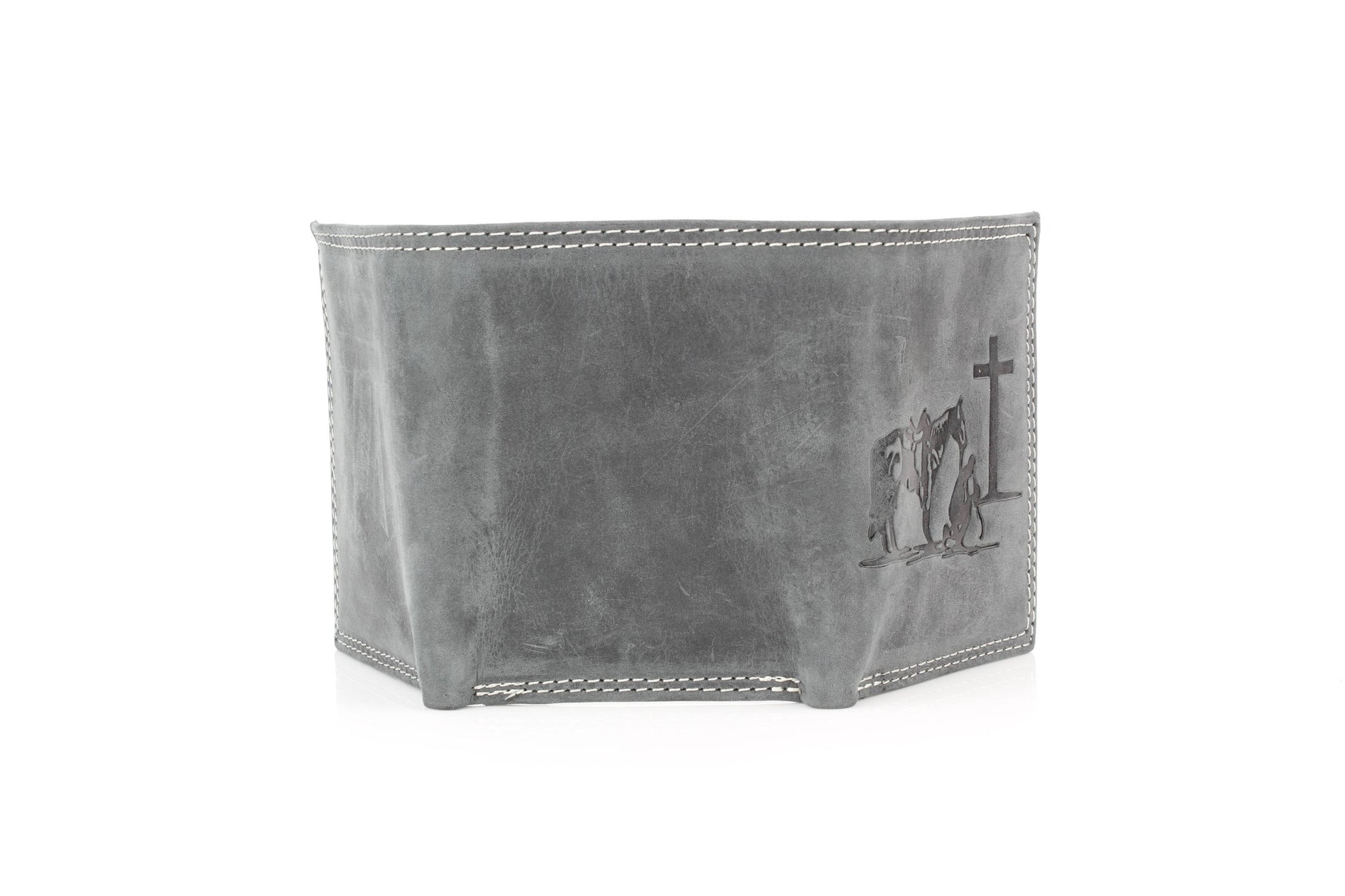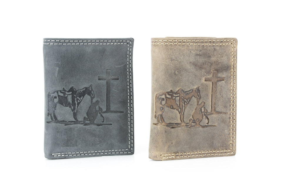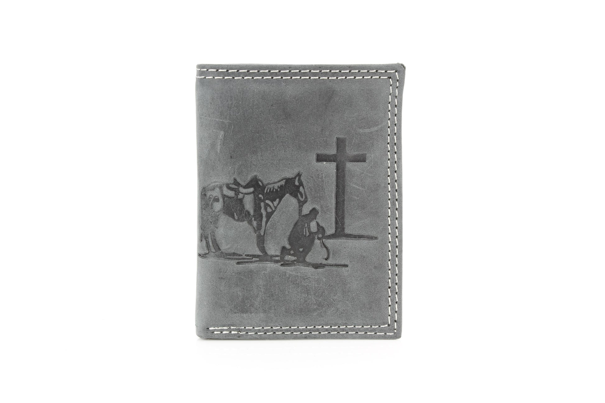 This men’s tri-fold wallet is crafted from rugged hunter leather and accented with clean white top-stitching along the edges for a classic Western look. The front showcases an embossed design of a kneeling/praying cowboy, adding meaningful character to the piece. Inside, the tri-fold design maximizes organization while staying compact, featuring one clear ID slot, six credit card slots, and two currency compartments for bills. Designed for durability and practicality, it easily slips into a pocket without bulk. Packaged in a sturdy cardboard box, this wallet is ideal as a gift or as a dependable everyday carry. Available in black and brown.