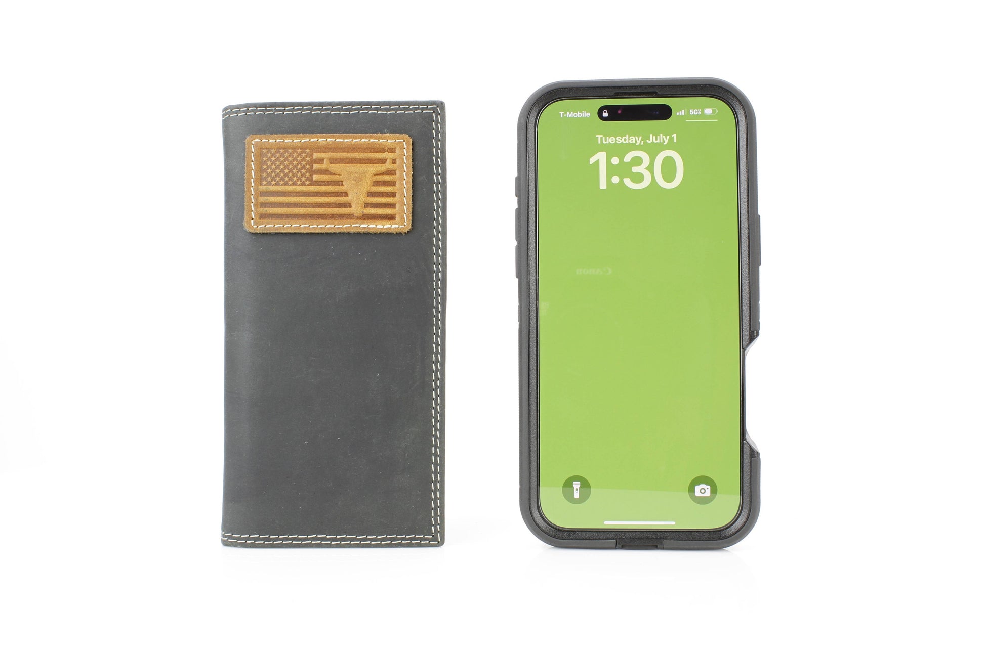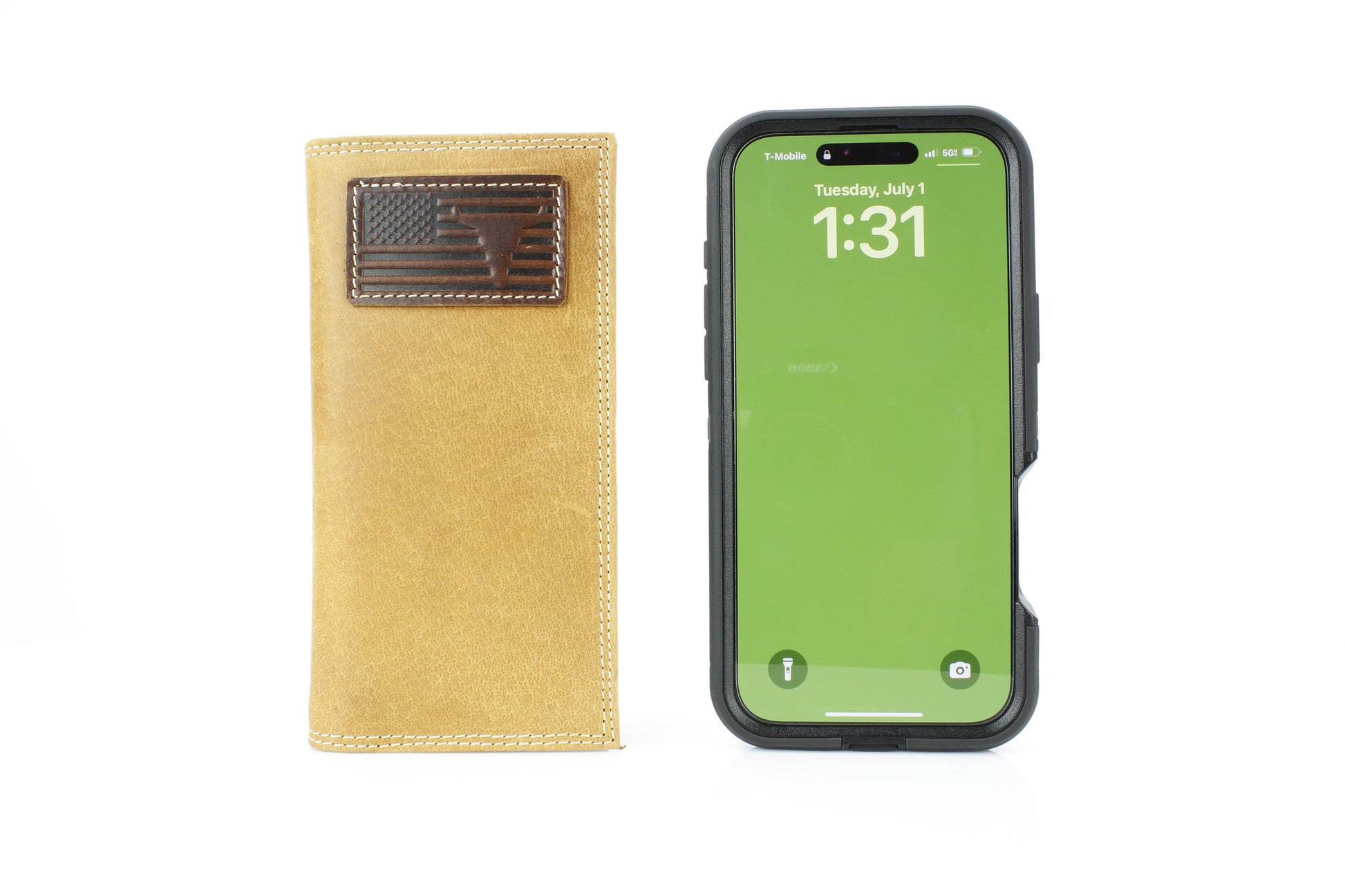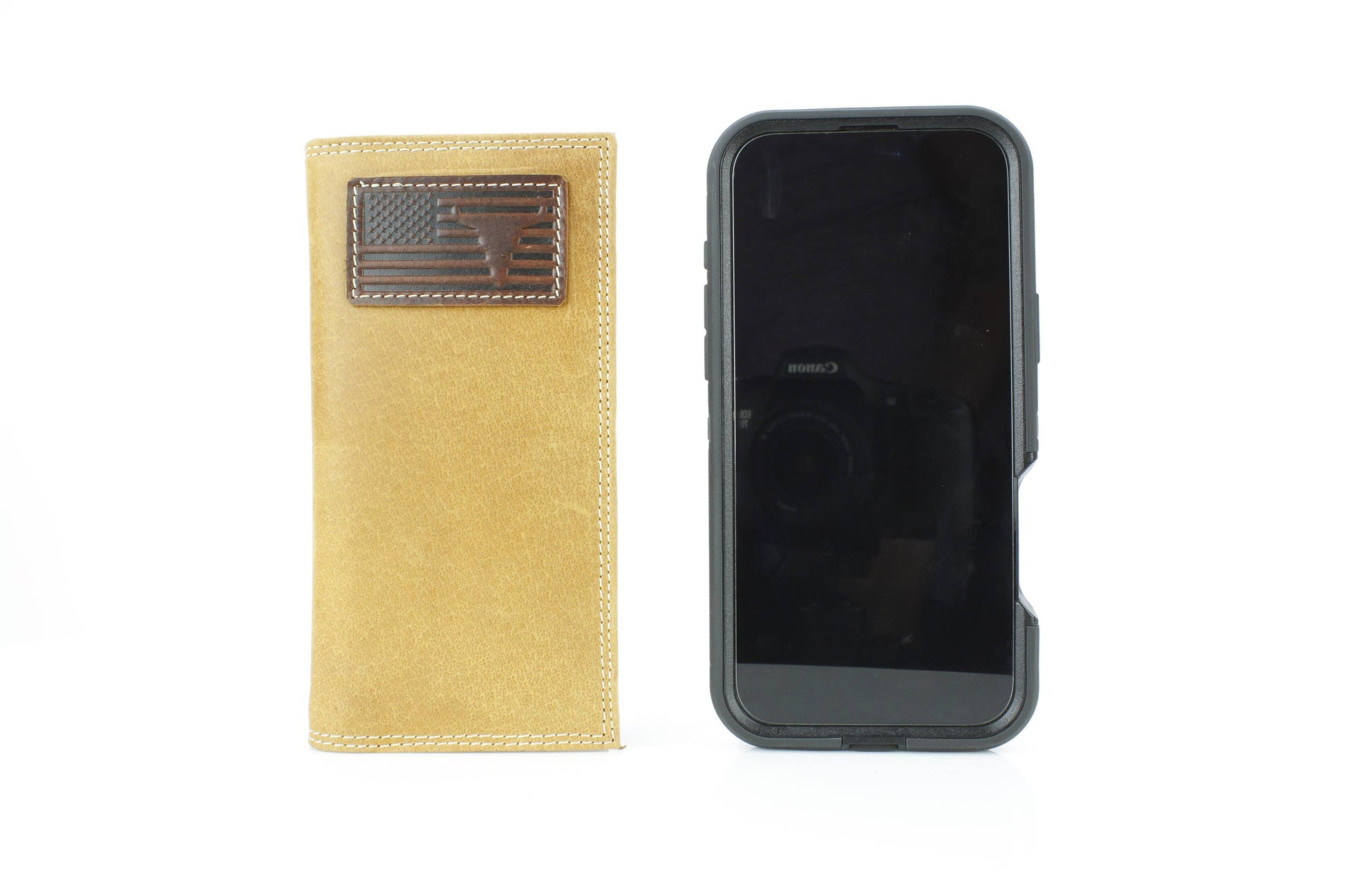 Crafted from genuine leather, this Rodeo Wallet embodies rugged heritage and patriotic pride. The front features a bold embossed patch of a bison skull layered over the American flag, symbolizing strength, freedom, and frontier spirit. Outlined with a double row of crisp white top-stitching, it delivers both durability and a sharp, distinctive look. Inside, the wallet is designed for maximum organization, including one clear ID slot, twelve credit card slots, and four vertical currency compartments to keep your bills and essentials neatly in place. A dedicated pen holder adds functionality, making this wallet a practical choice for everyday use or travel. Presented in a wooden box, it also makes a perfect gift. Available in black, brown, and tan.
