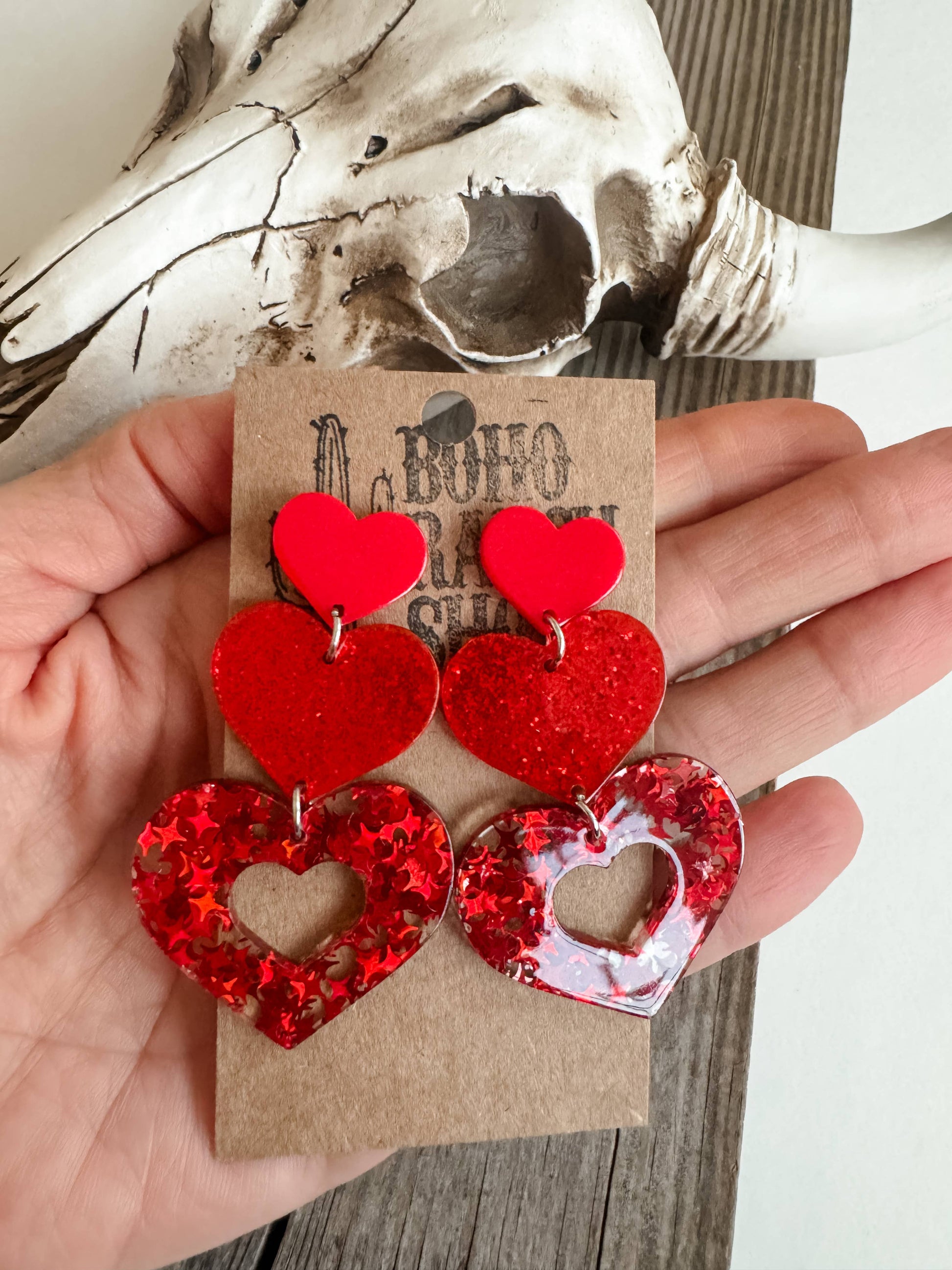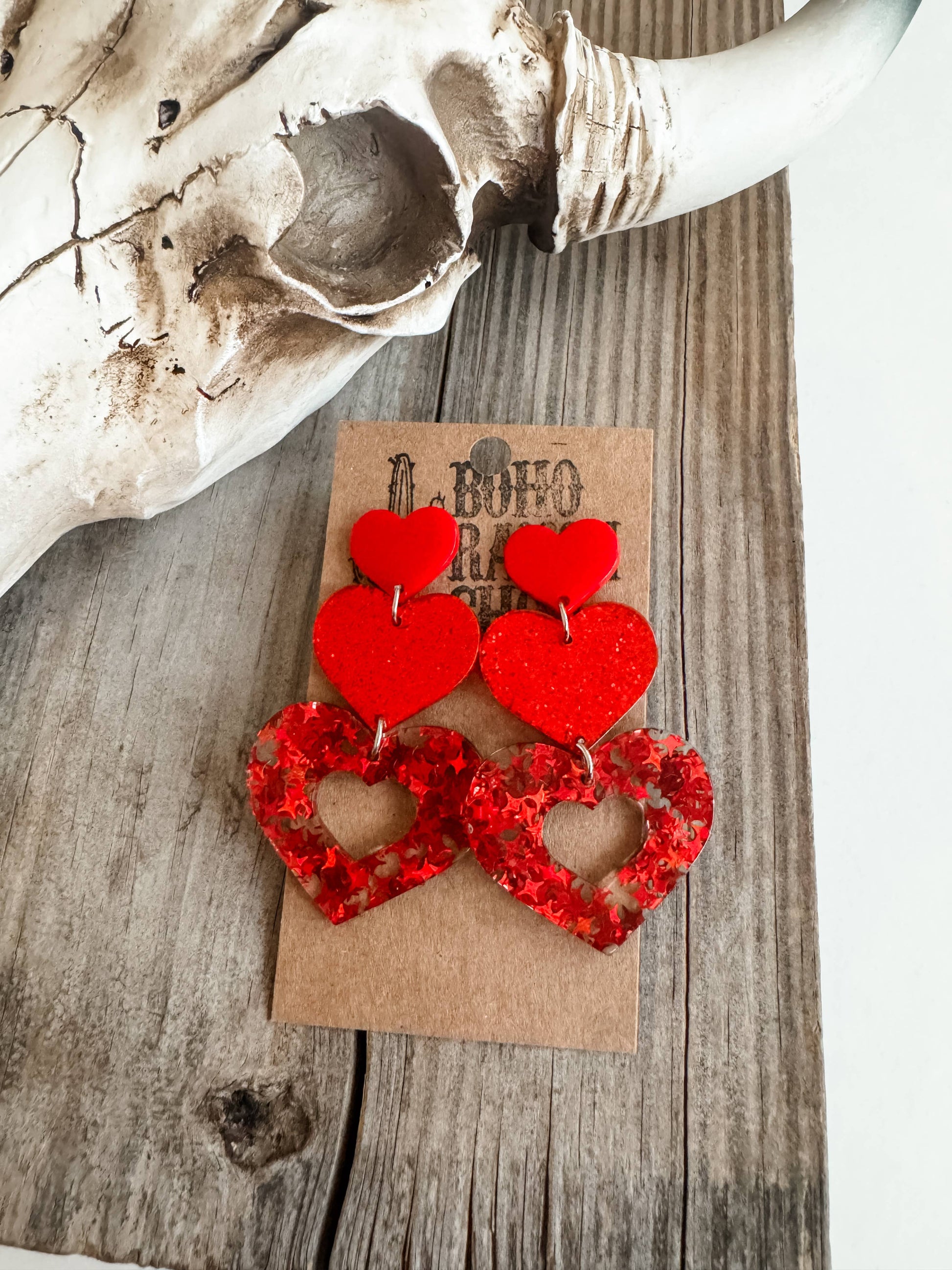 These earrings consist of three resin red hearts stacked on top of each other. The smallest heart features a glossy finish, the middle one is covered in glitter, and the bottom one has star-shaped sequins.