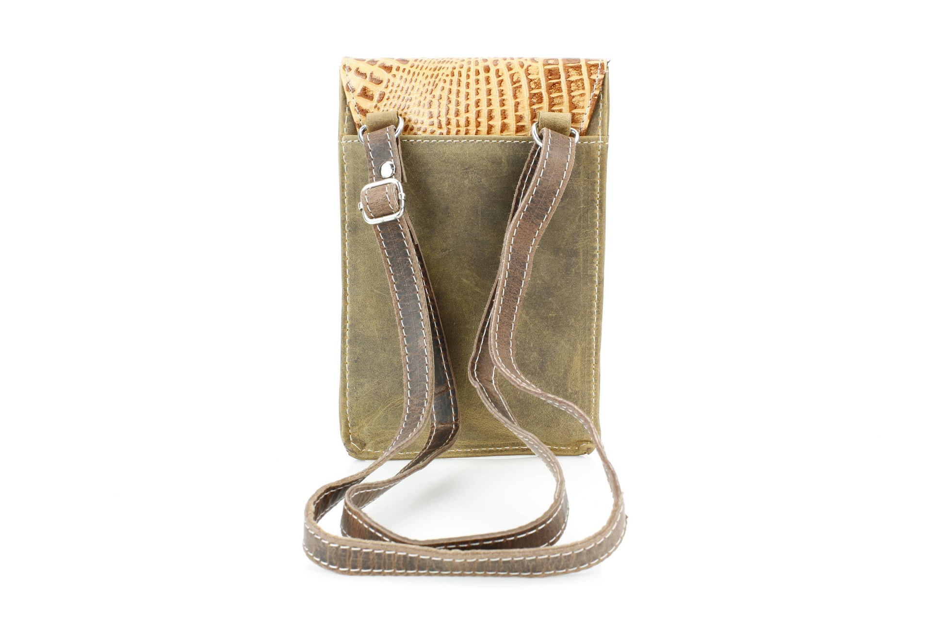 This compact women’s messenger bag combines bold texture with refined elegance. The flap is embossed with a crocodile pattern in a camel finish, giving it a striking yet sophisticated character. Balanced by a smooth tan body, the design offers versatile appeal that pairs effortlessly with a range of outfits. At the center, a polished oval plaque engraved with a bison motif provides a signature touch. Compact in size yet practical in function, this bag is designed with thoughtful compartments to keep essentials organized. Finished with a slim, adjustable strap, it is lightweight, stylish, and perfect for both everyday use and special occasions.
