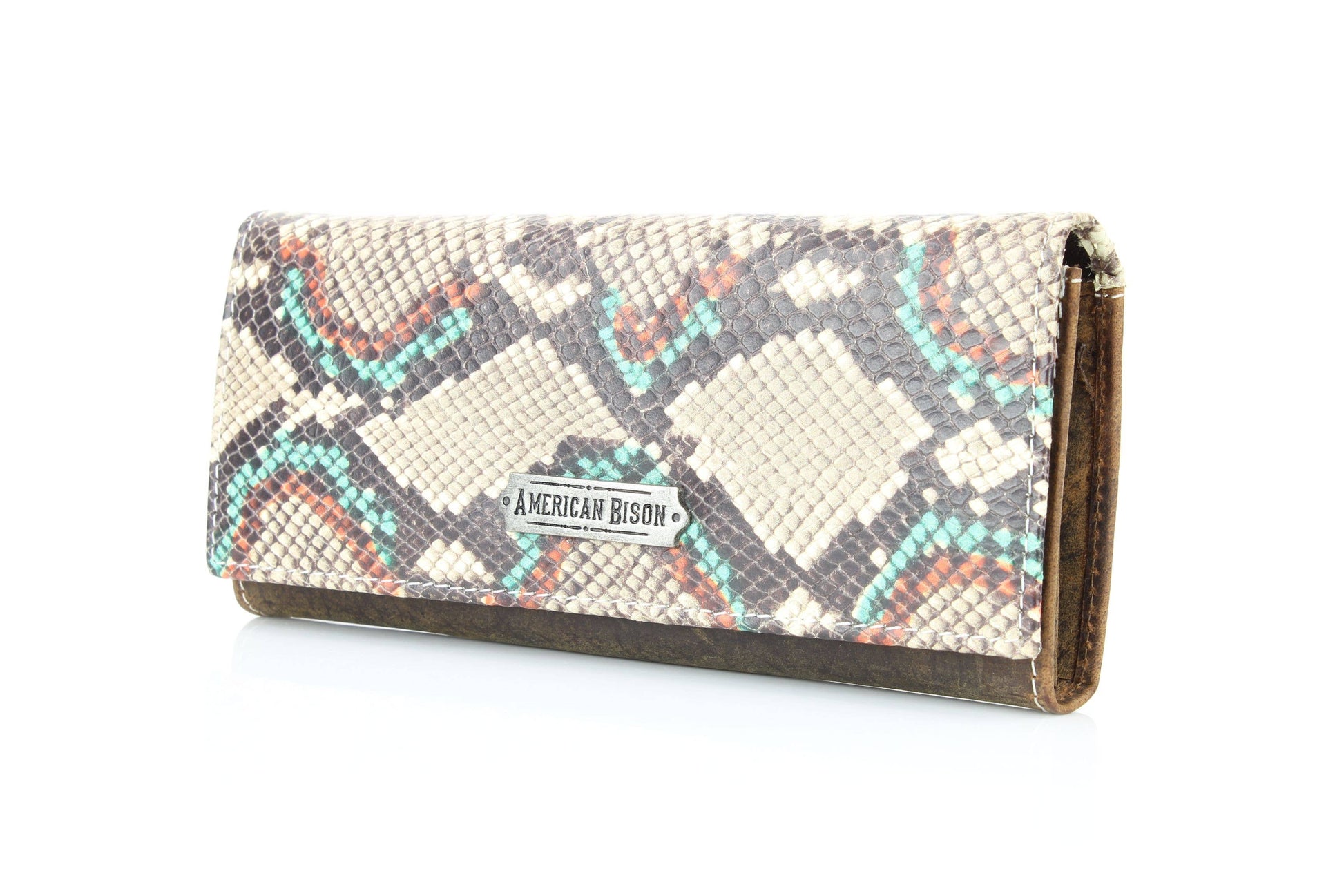 This women’s wallet features a tan leather base paired with a snake skin-patterned flap, accented by splashes of turquoise and saffron for a distinctive, artistic touch. A metal plate engraved with “American Bison” adds a refined finish. The interior offers smart organization with one ID slot, five credit card slots, two currency compartments, and a secure center zip pocket. An exterior zip pocket completes the functional design.